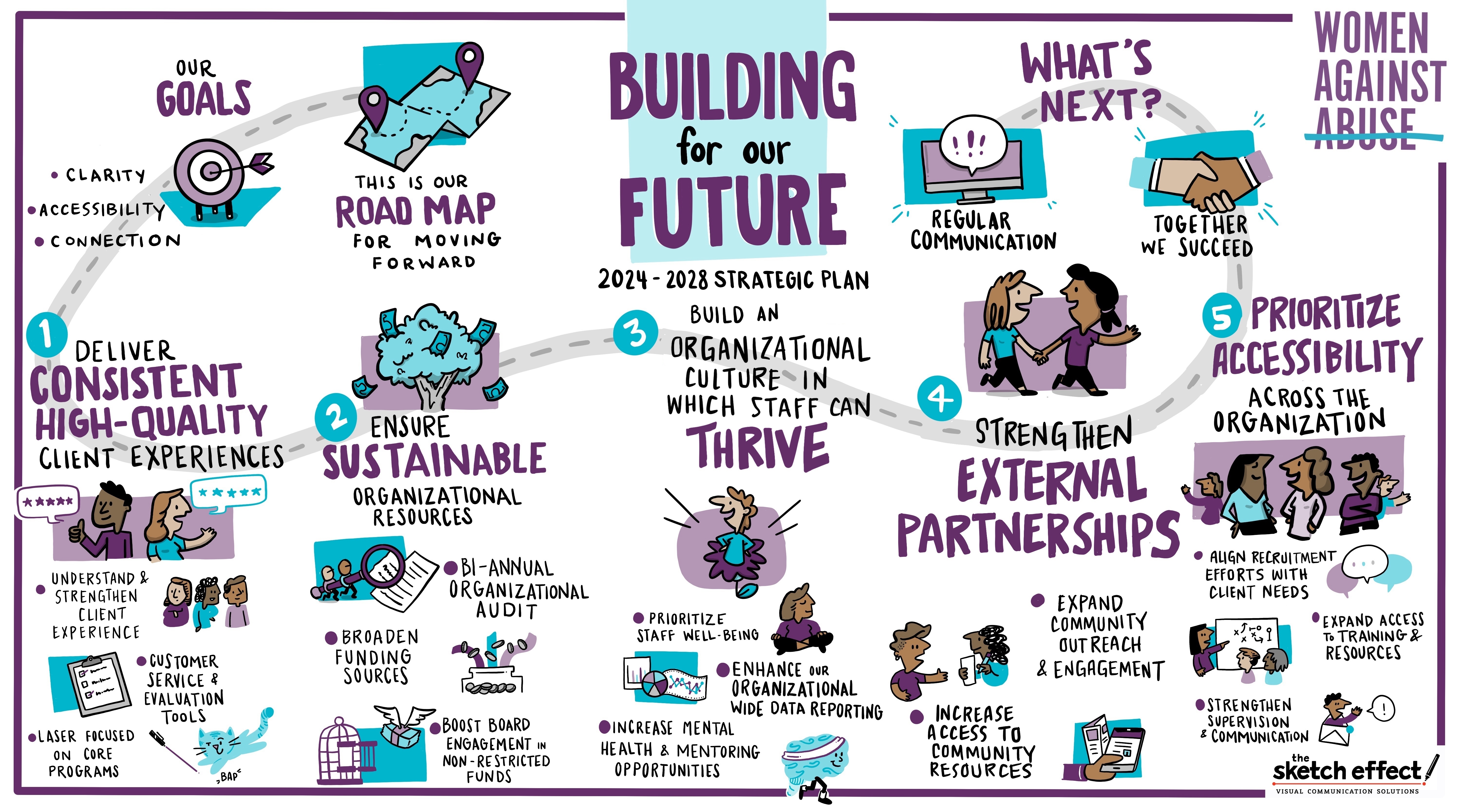 WAA was excited to partner with Anavi Strategies to develop this 5-year strategic plan. Together, we spent eight months analyzing organizational data, conducting interviews with team members and external partners, and facilitating strategic planning sessions with Board members, organizational leadership, and staff. Client survey data and focus group results have been integrated throughout the strategic plan to ensure the voices of survivors are front and center.